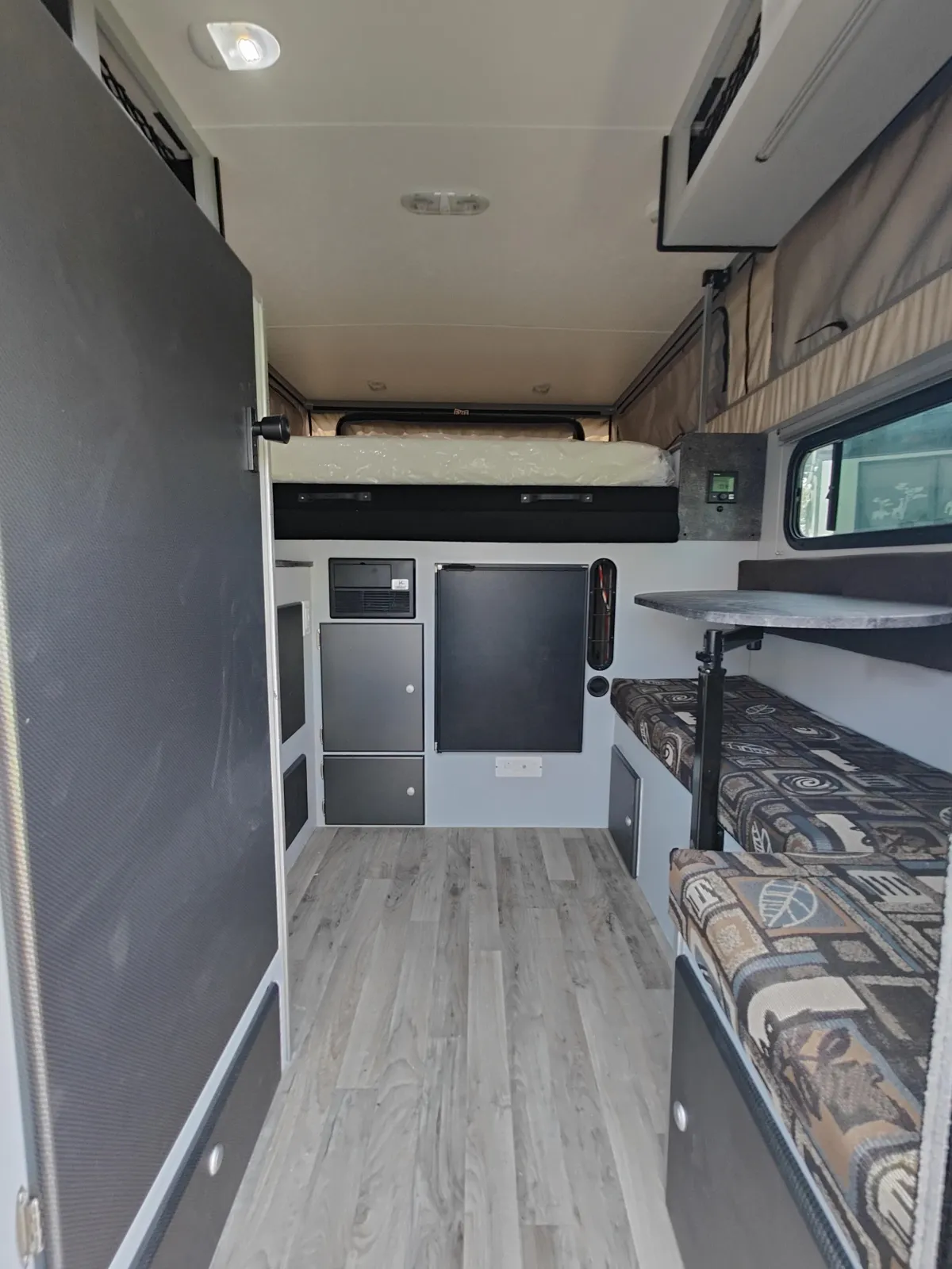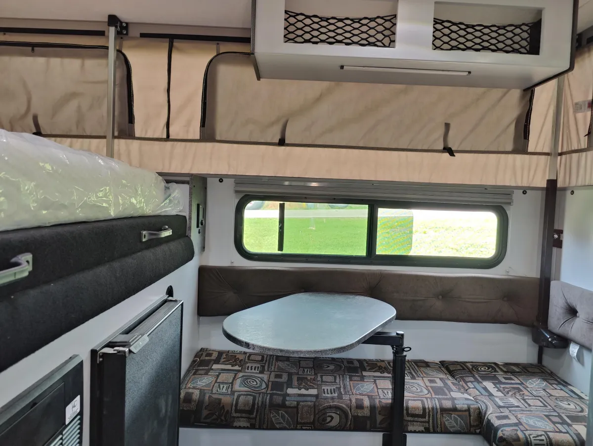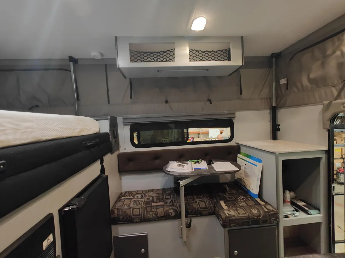 Kitchen Overhead Cabinet with Netting, Insulated Skylight, 380W Solar Package, Electric Jacks, Exterior Shower Enclosure, Insulated Tent Panel Set, Cell Phone Booster, TraxTab